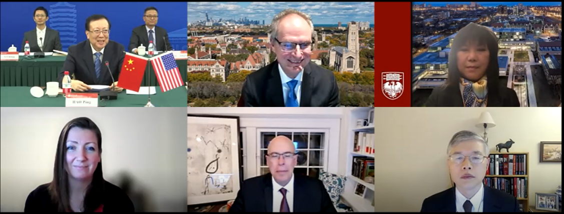 2022年1月5日上午,北京大学与芝加哥大学举行线上会晤。北京大学校长郝平与芝加哥大学校长阿利维萨托斯(Paul Alivisatos)云端相聚,共同见证北京大学芝加哥中心在线揭牌,并就两校开展务实合作进行深入交流。北京大学副校长王博主持会议。