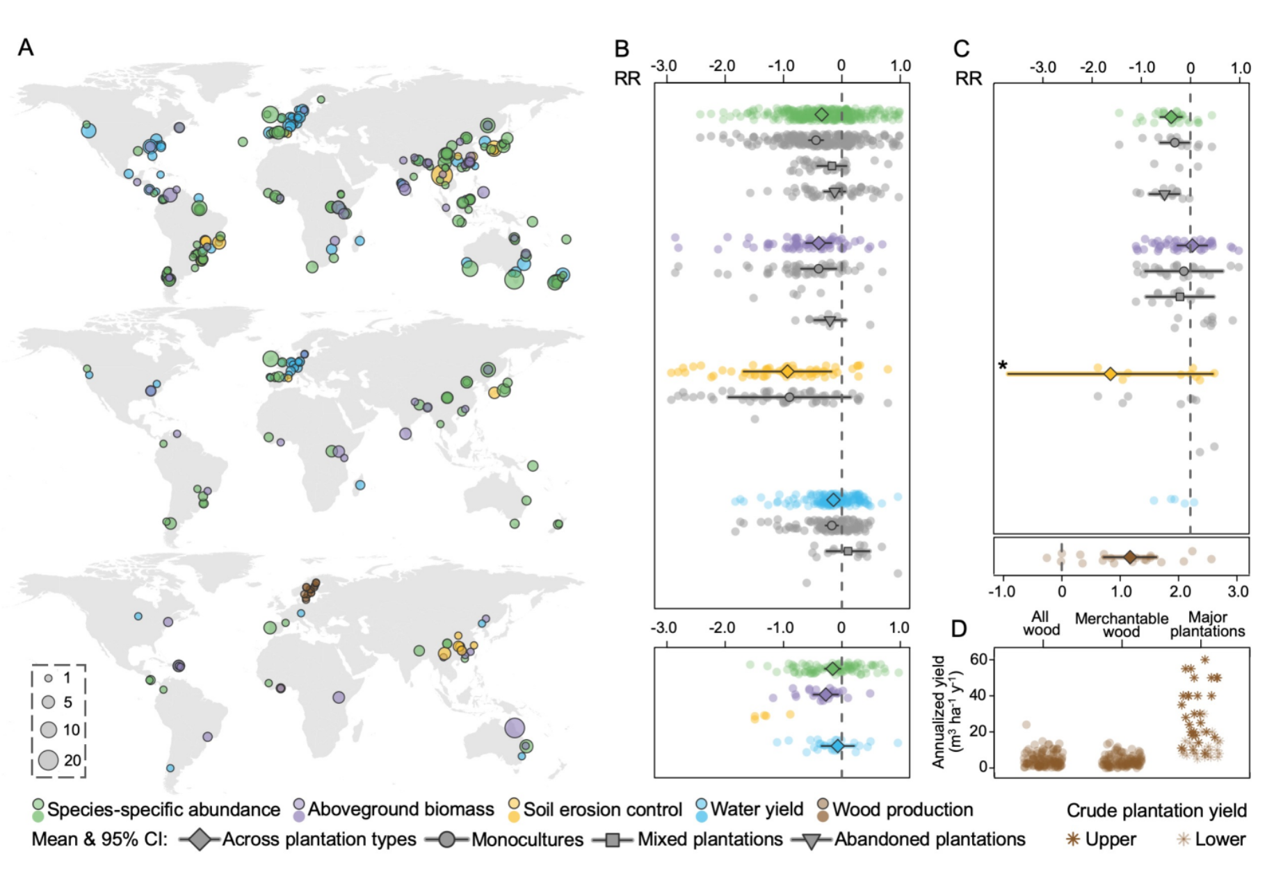 人工林(与天然林相比)在生物多样性与生态系统服务各个维度的评估:A-数据来源分布及数据量;B-人工林与成熟天然林相比的相对成效(上图),林龄较老或处于废弃状态的人工林与天然林相比的相对成效(下图);C-人工林与恢复的天然林相比的相对成效,包括木材生产 (下图);D-恢复的天然林与全球主要单一树种人工林在木材年均产量上的对比(图片来源:文章)