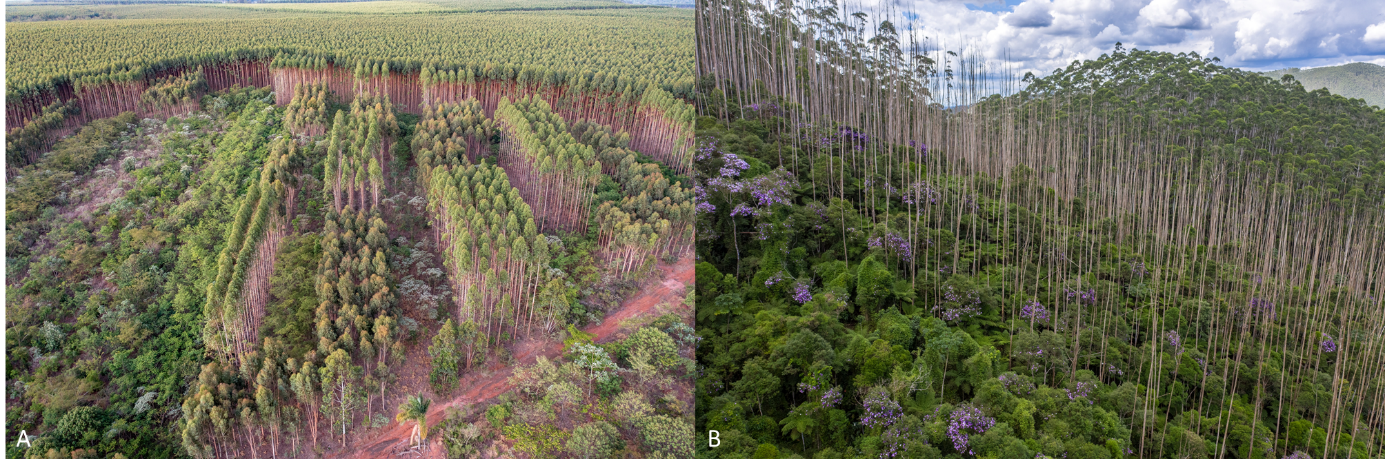 创新性的天然林恢复试点:A-巴西圣保罗州Itatinga圣保罗大学森林实验站的桉树人工林景观中,通过自然恢复、人工辅助的自然恢复、人工种植多样本土植物等方式恢复天然林生态系统;在种植有桉树的实验地,桉树在种植5年后采伐,木材收入可用于帮助承担恢复项目的成本;B-巴西圣保罗州Bertioga对桉树人工林进行改造,用药剂杀死桉树,让本地植物群落自然生长,最终恢复为本地原有的大西洋雨林(图片来源:Paulo Molin和Pedro Brancalion)