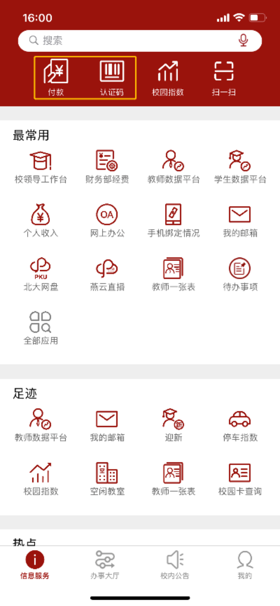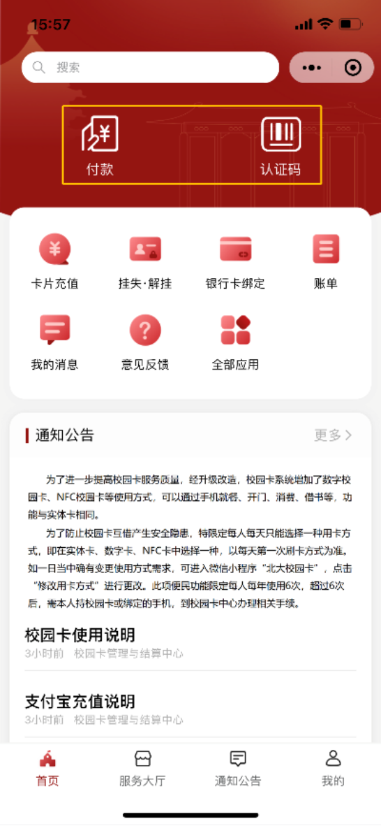 新建设的数字校园卡服务支持微信小程序和手机App两种方式,北大师生手中的任何一部智能手机都可以便捷地使用数字校园卡功能。在微信中搜“北大校园卡”小程序,或者下载并安装“北京大学”App客户端,点击“付款”即可消费,点击“认证码”即可进门。