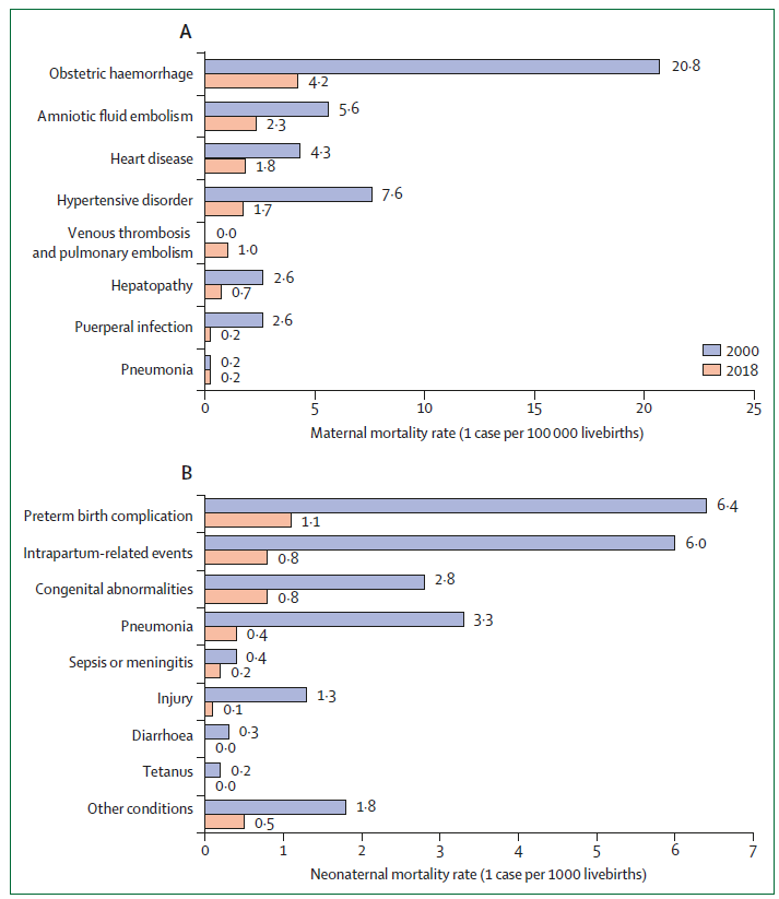 图7|2000年和2018年中国孕产妇及新生儿死因变化