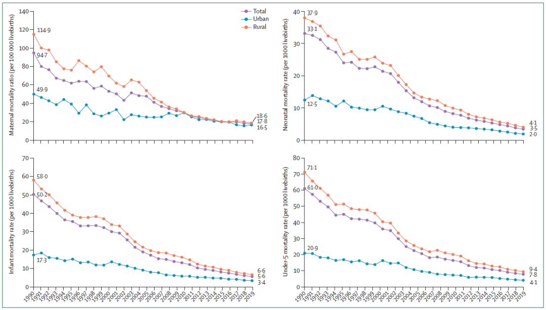 图1|孕产妇及儿童死亡率快速下降、城乡差距缩小(1990-2019年)