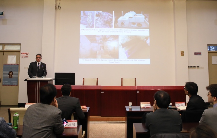 会见结束后,阿纳尼赴考古文博学院发表以“Egyptian Archaeology and Current Projects”(埃及考古与近期项目)为主题的演讲。阿纳尼在演讲中介绍了埃及近年来的考古发现、文物保护、科学研究、流失文物国际申索、遗址和博物馆公众开放等方面的重要工作,给聆听讲座的北大师生留下了深刻的印象。讲座之后,阿纳尼还与北大师生合影,并参观了北京大学赛克勒考古与艺术博物馆的“千山共色——丝绸之路文明特展”。