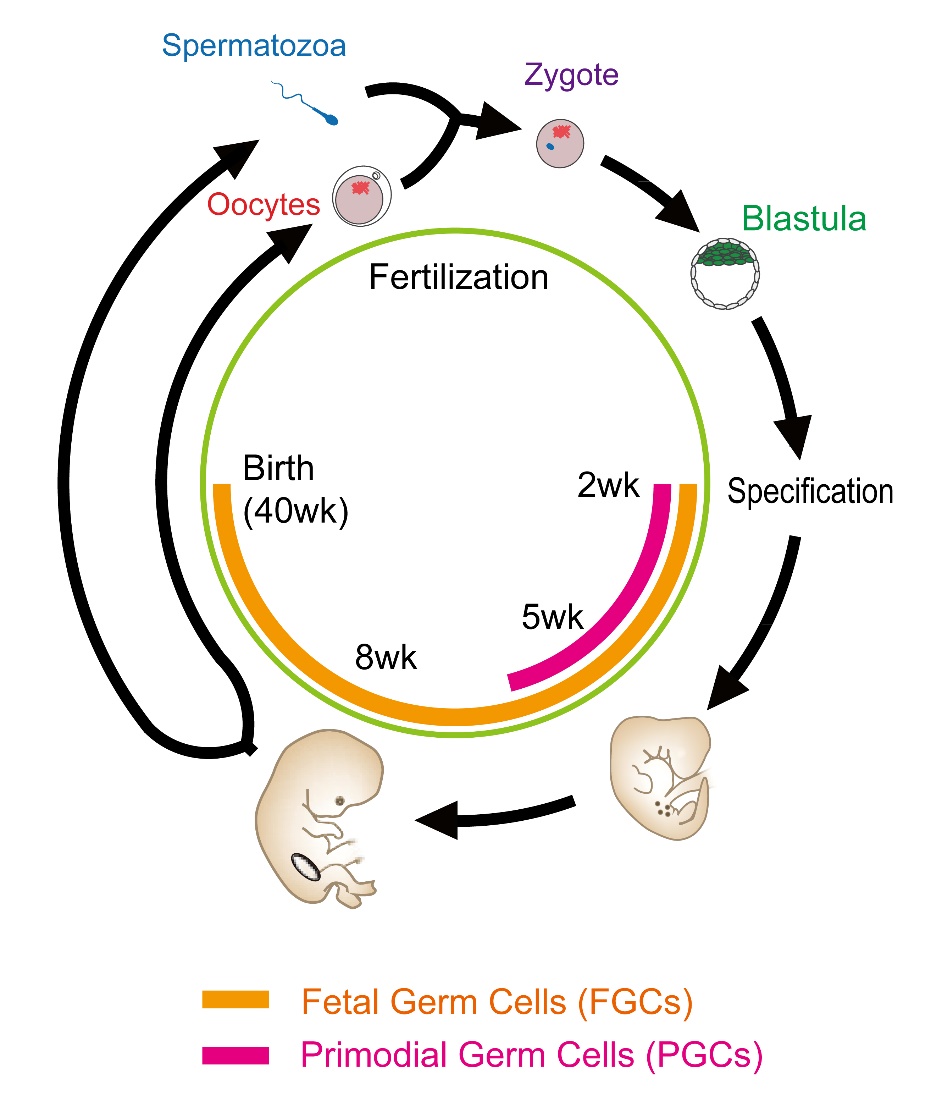 生殖系细胞(Germline cells)是指多细胞生物个体中携带种系遗传物质的所有细胞类型,包括由精子与卵细胞结合而产生的全能性受精卵、胚胎着床前后的多能性内细胞团细胞和上胚层细胞、单能性胚胎生殖细胞、个体出生后的生殖细胞以及成熟的精子与卵细胞(图一)。在多细胞生物物种数百万年的进化历程中,其生殖系细胞是“永生”的细胞类型,会将该物种的遗传信息不断从上一代传递到下一代。