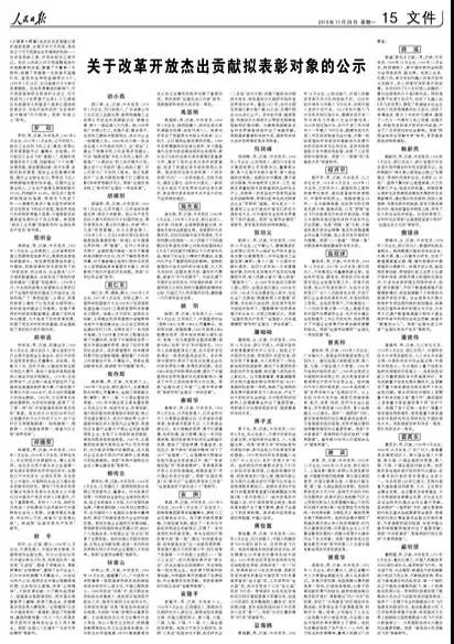 今天,中央庆祝改革开放40周年表彰工作领导小组办公室,通过《人民日报》公示了一份重磅名单——为庆祝改革开放40周年,党中央决定表彰一批为改革开放作出杰出贡献的个人。