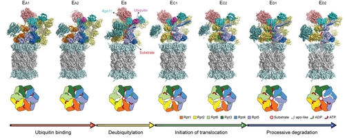 七个利用冷冻电镜解析的精细原子结构,完整揭示了从泛素识别、去泛素化反应、转运启动和持续降价的核心功能动态过程