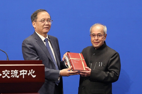 演讲会后,慕克吉总统与林建华校长互赠礼物。总统阁下为北京大学图书馆准备了350本梵语和孟加拉语书籍,这些书籍涉及印度文学、文化、瑜伽以及泰戈尔先生的生平。北京大学赠送给慕克吉总统的是北大学者在中印文化方面的研究成果,包括季羡林先生全集。