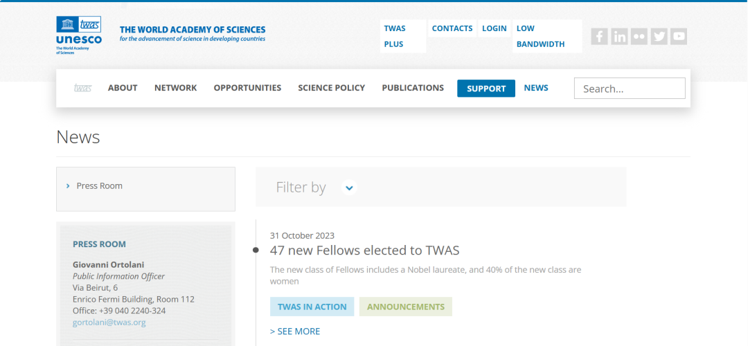 2023年10月31日,发展中国家科学院(TWAS)公布新增院士名单,共增选47位发展中国家科学院院士,其中6位来自于中国大陆。