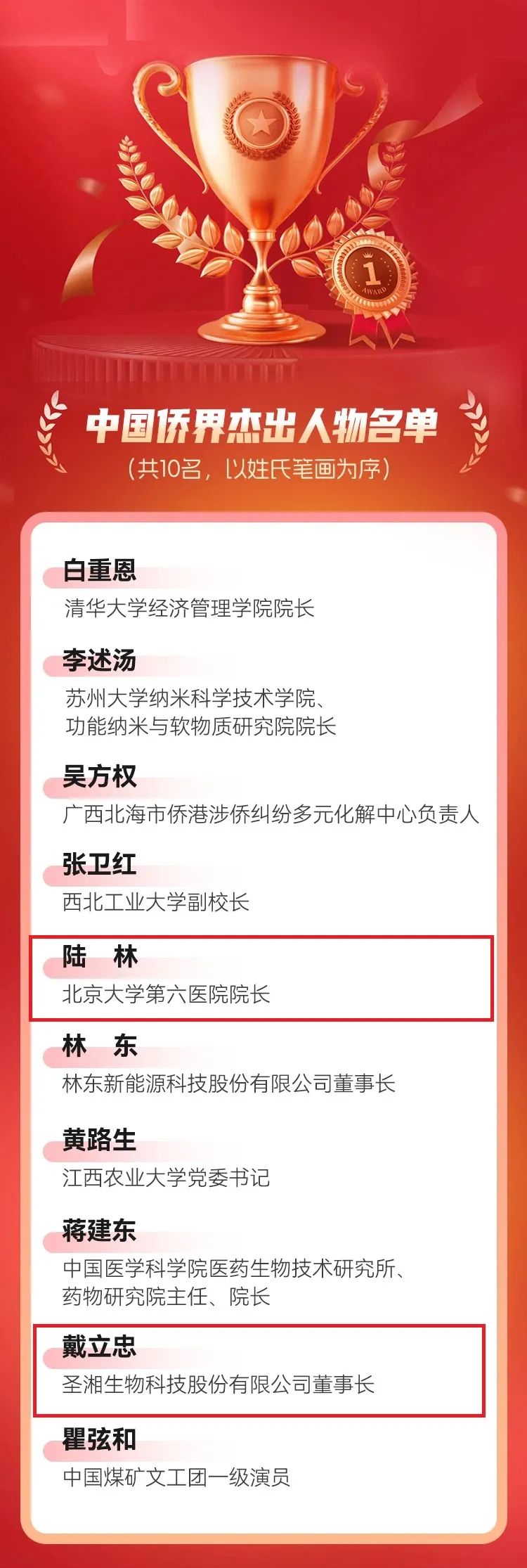 中国科学院院士、北京大学第六医院院长陆林,圣湘生物科技有限公司董事长、北京大学化学系1986级本科校友戴立忠被授予“中国侨界杰出人物”荣誉称号。