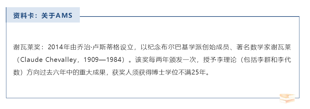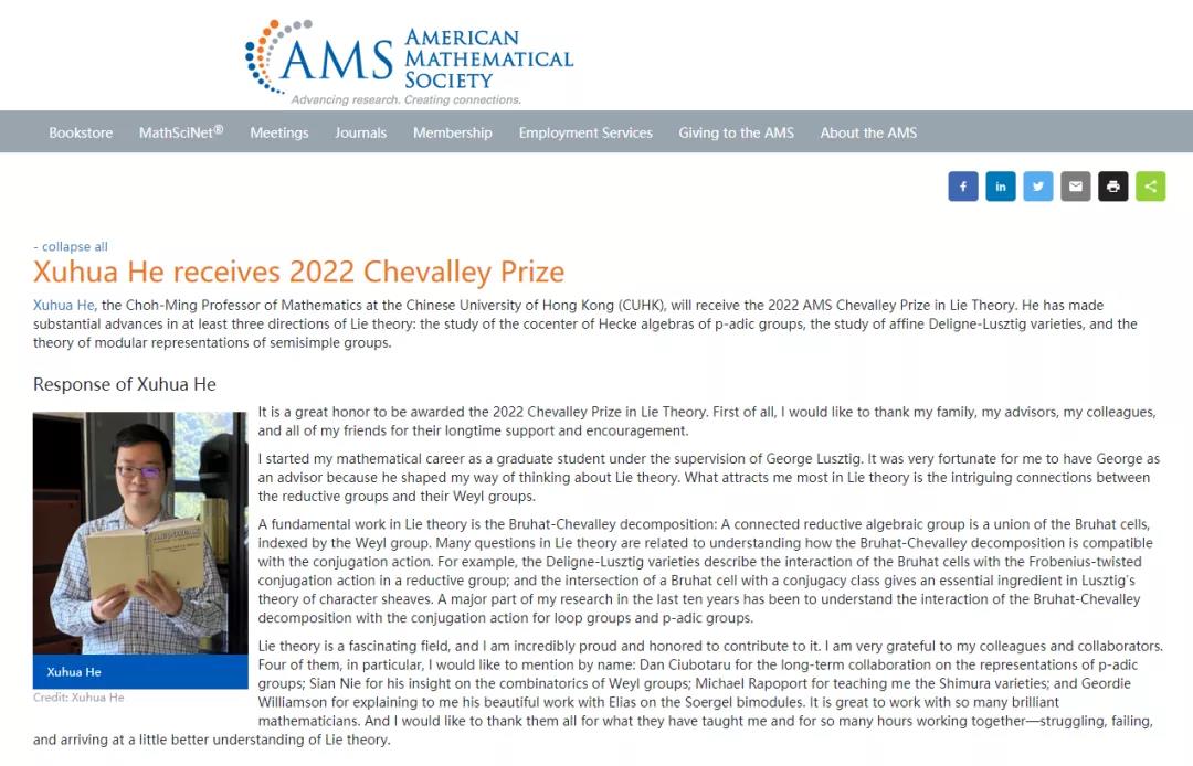 当地时间2021年10月6日,美国数学会(American Mathematical Society)发布获奖公告,授予北京大学1997级数学科学学院本科校友、香港中文大学教授、2020年“科学探索奖”数学物理学领域获奖人何旭华“2022年美国数学会李理论谢瓦莱奖”(the 2022 AMS Chevalley Prize in Lie Theory), 以表彰他在李理论方向取得的重大进展,包括p-进制群的赫克代数的余中心,仿射德利涅-卢斯蒂格簇,半单群的模表示论。该奖项将于2022年1月5日(周三)在西雅图举行的2022年联合数学会议上颁发。