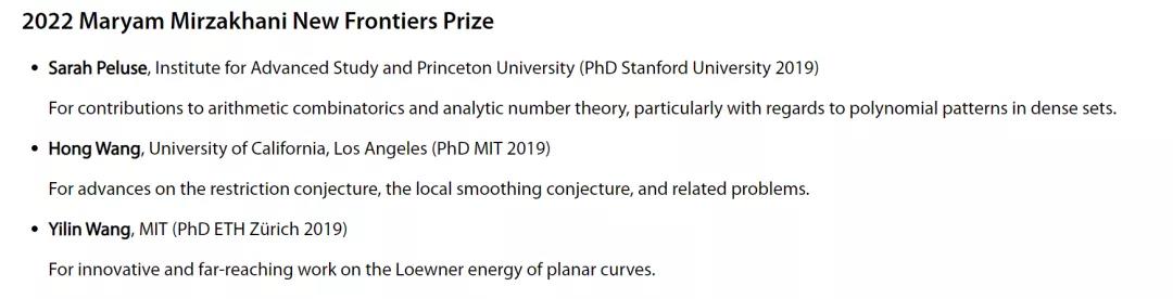 玛丽安·米尔扎哈尼新前沿奖于2019年设立,纪念2017年不幸去世的首位女性菲尔兹奖获得者——玛丽安·米尔扎哈尼,同时表彰在学术生涯早期取得成就的女性数学家。获得者需是在过去2年之内获得博士学位的女性数学家。王虹院友因其在限制性猜想、局部光滑性猜想及相关问题上的研究进展而获奖。