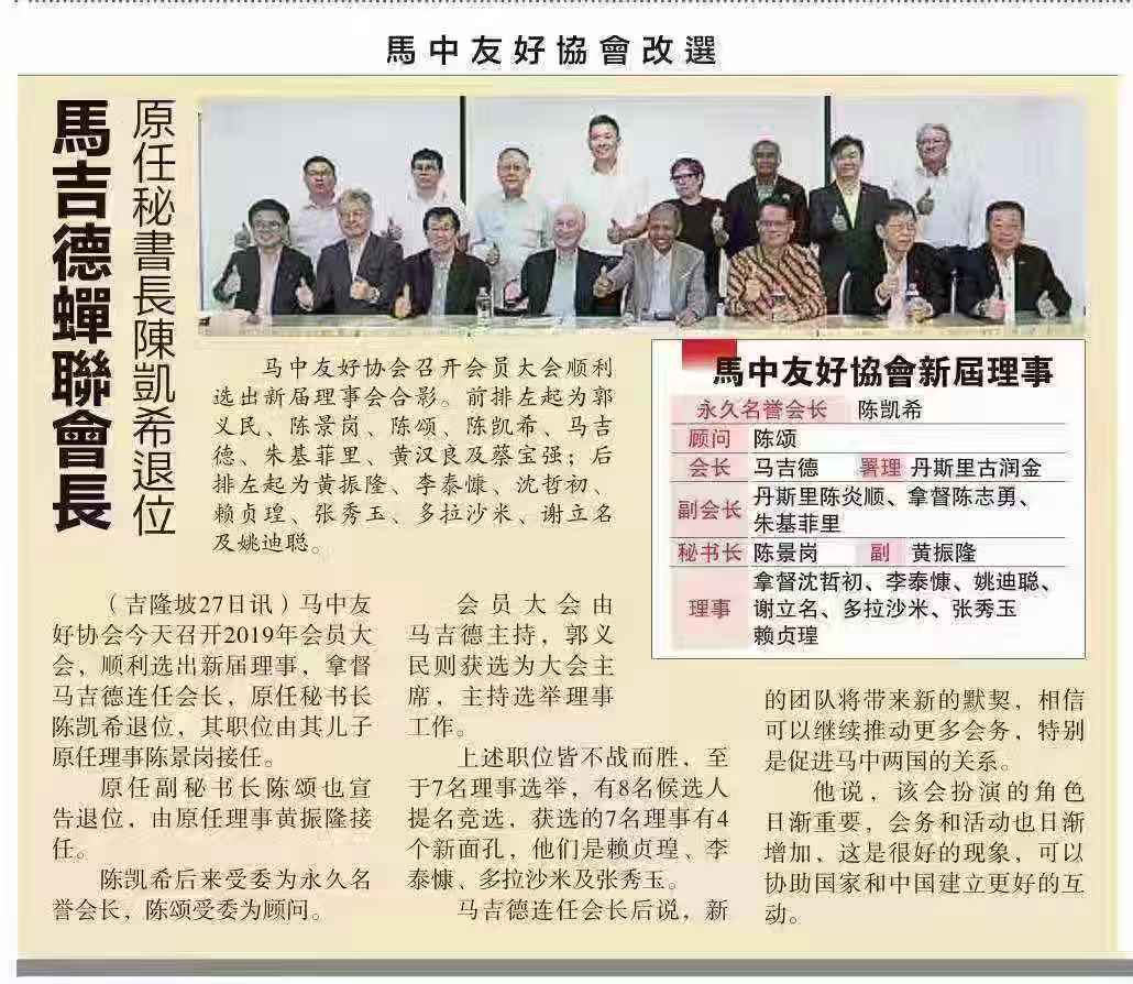 积极参与创办马中友好协会并长期担任协会秘书长陈凯希并于当日大会上卸任,并获聘为马中友好协会永远名誉会长,表彰其长期致力马中友好的贡献。陈凯希之子、北京大学校友陈景岗出任新任秘书长,北京大学校友赖贞瑝获选为新任理事。