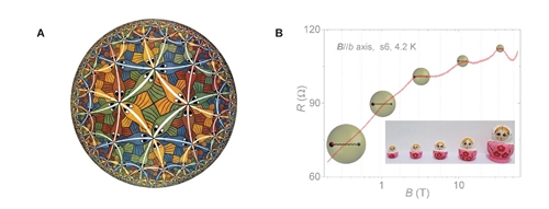 研究团队通过进一步分析,证明这一新奇发现中的磁电阻振荡对数周期性实质上是离散标度不变性的明显特征。标度不变性指体系在任何尺度下都是自相似的,体系不存在特定的特征尺度。离散标度不变性是连续标度不变性破缺的结果,其显著特征是体系的特征尺度满足等比数列。对数周期振荡是离散标度不变性的典型特征,这一特征在动物学、金融危机、地震、湍流等多种研究领域中都有所体现。在经典物理体系里,离散标度不变性存在于非线性方程导致的分形结构中,譬如著名数学物理学家庞加莱提出的庞加莱圆盘模型就是一种满足自相似性的分形结构,参见荷兰著名画家埃舍尔的画作Circle Limit III(图2A)。对于量子体系,目前已知的只有Efimov三体束缚态表现出离散标度不变的行为。近年来,Efimov三体束缚态在冷原子实验中得到了观测,进而激发了相关领域极大的研究热情。