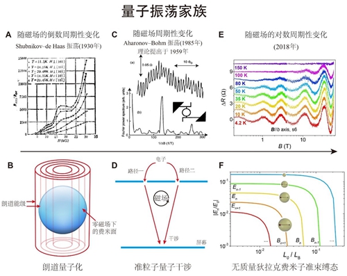 图1:量子振荡家族。(A、B)随磁场的倒数周期性变化的量子振荡,典型代表为磁电阻中的SdH振荡,起源于朗道能级的量子化;(C、D)随磁场周期性变化的量子振荡,代表为磁电阻中的AB振荡和AAS振荡,起源于准粒子的量子干涉;(E、F)随磁场的对数周期性变化的量子振荡,其物理机制为:无质量狄拉克费米子在超临界库仑吸引下形成两体准束缚态,这些满足离散标度不变性的准束缚态在磁场的影响下逐个经过费米面,引起磁电阻的对数周期量子振荡