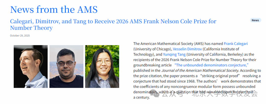 据美国数学学会(AMS)消息,2026年度弗兰克·纳尔逊·科尔数论奖授予了芝加哥大学的弗兰克·卡莱加里、加州理工学院的维塞林·迪米特罗夫以及加州大学伯克利分校的唐云清,以表彰他们发表于《美国数学会杂志》(Journal of the American Mathematical Society)的突破性论文《无界分母猜想》(The unbounded denominators conjecture)。据颁奖词称,该论文以“极具原创性的证明"解决了自1968年悬置至今的猜想。作者的研究证实,任何非同余模形式的系数均具有无界分母,这一问题的解决为长达半个多世纪的争论画上句号。