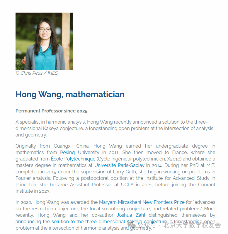 王虹,2008年至2011年本科就读于北京大学数学科学学院,获得学士学位;2014年获巴黎综合理工学院工程师学位和巴黎第十一大学硕士学位;2019年获麻省理工学院博士学位; 随后在普林斯顿高等研究院做博士后。曾任加州大学洛杉矶分校助理教授,纽约大学柯朗数学科学研究所副教授、教授,现任法国高等研究所(IHES)终身教授。在调和分析和几何测度论领域取得重要成果,多篇文章在Annals of Mathematics、Inventiones mathematicae等发表,2022年获得Maryam Mirzakhani新前沿奖。