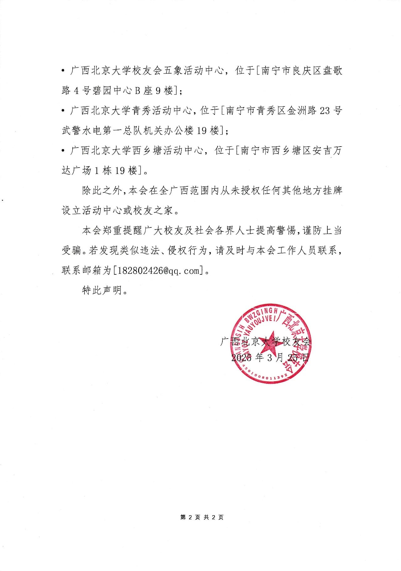 除此之外,本会在全广西范围内从未授权任何其他地方挂牌设立活动中心或校友之家。