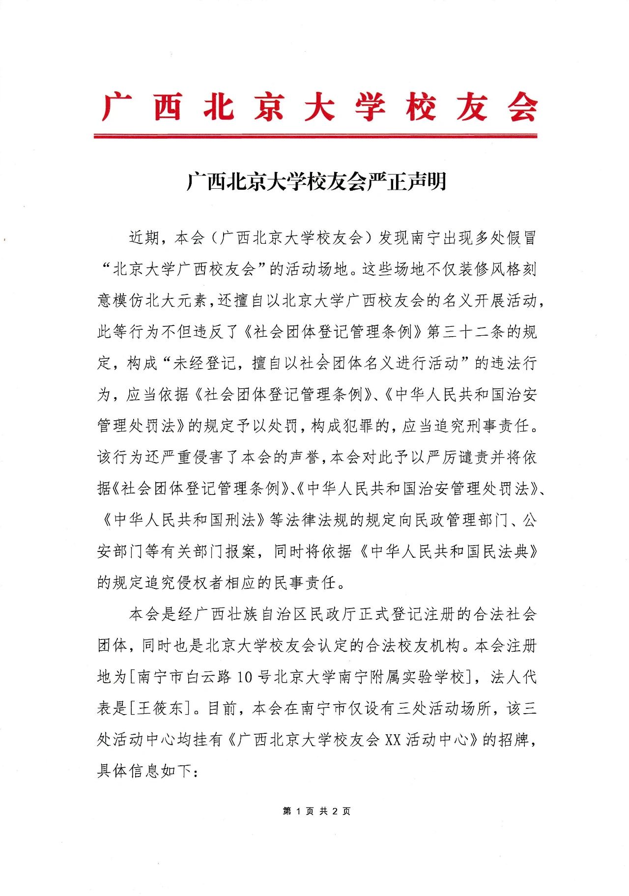 近期,本会(广西北京大学校友会)发现南宁出现多处假冒“北京大学广西校友会”的活动场地。这些场地不仅装修风格刻意模仿北大元素,还擅自以北京大学广西校友会的名义开展活动,此等行为不但违反了《社会团体登记管理条例》第三十二条的规定,构成“未经登记,擅自以社会团体名义进行活动”的违法行为,应当依据《社会团体登记管理条例》、《中华人民共和国治安管理处罚法》的规定予以处罚,构成犯罪的,应当追究刑事责任。该行为还严重侵害了本会的声誉,本会对此予以严厉谴责并将依据《社会团体登记管理条例》、《中华人民共和国治安管理处罚法》、《中华人民共和国刑法》等法律法规的规定向民政管理部门、公安部门等有关部门报案,同时将依据《中华人民共和国民法典》的规定追究侵权者相应的民事责任。