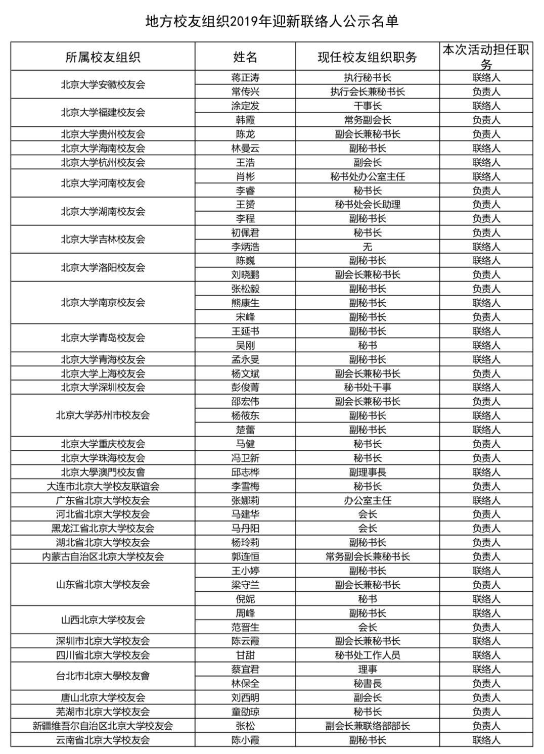 根据《关于开展2019年毕业季“北大毕业生微信群”活动的通知》,自2019年6月18日至6月28日,北京大学校友会、校友工作办公室向各备案校友组织征集对接2019年毕业生校友组织联络人。为了保证联络人有效性,请各备案校友组织做好核实、监督工作。现将校友组织联络人报名名单公示如下(详见附件),公示期为2019年6月28日至7月4日。