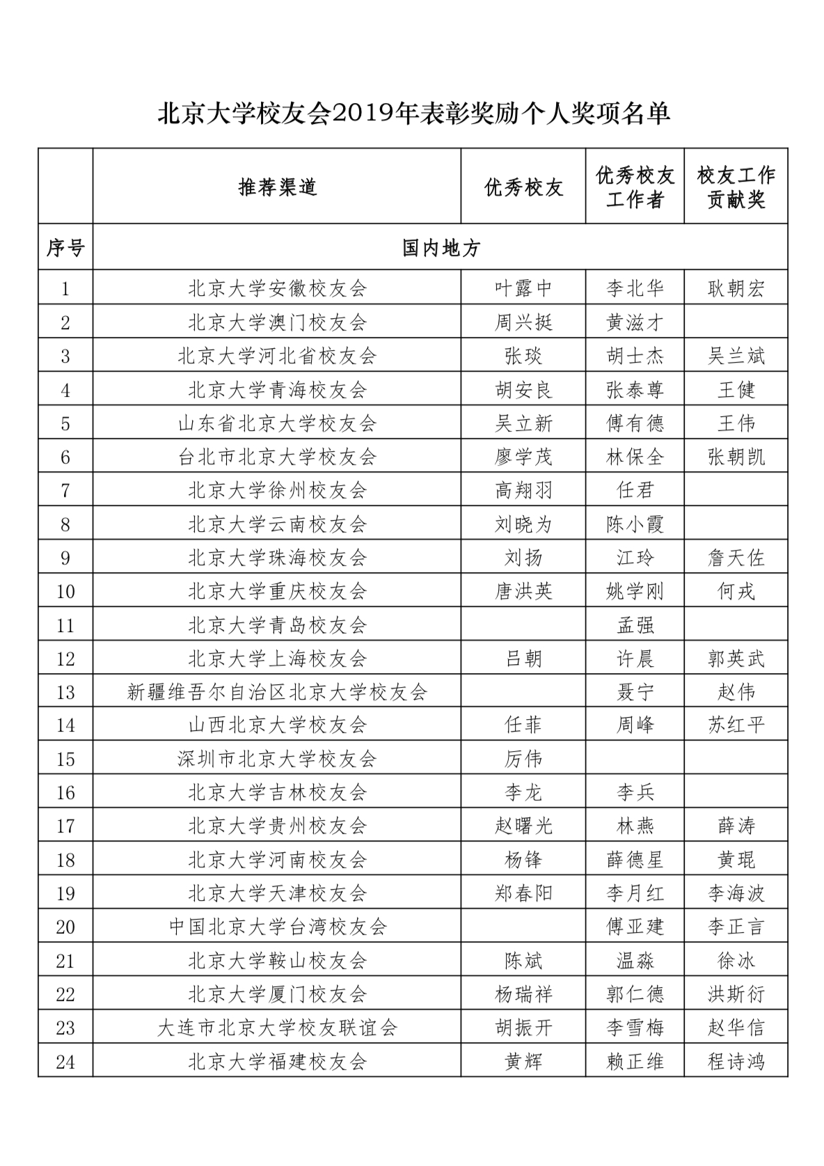 根据《北京大学校友会表彰奖励办法》,北京大学校友会2019年校友工作表彰奖励评审会于2019年11月7日在北京大学举行。评审结果经第九届常务理事会第四次会议审议通过,现通报名单如下: