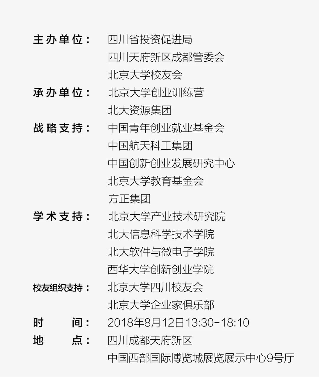 2018年8月12日,中国创业者峰会将走进成都天府新区。会议将依托北京大学科教资源,发挥大企业开放创新优势,汇聚创新要素,凝聚产业力量,以双创驱动产业转型升级、产城融合发展,促进新旧动能转换,助力国家经济高质量发展。