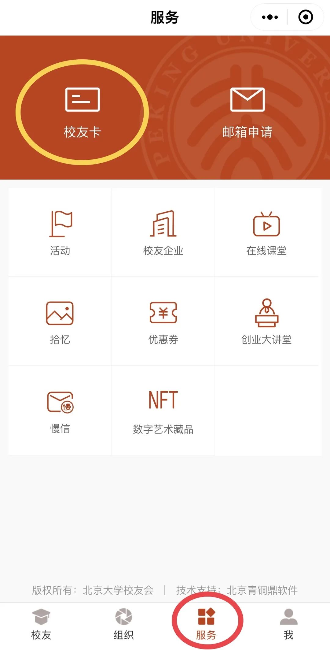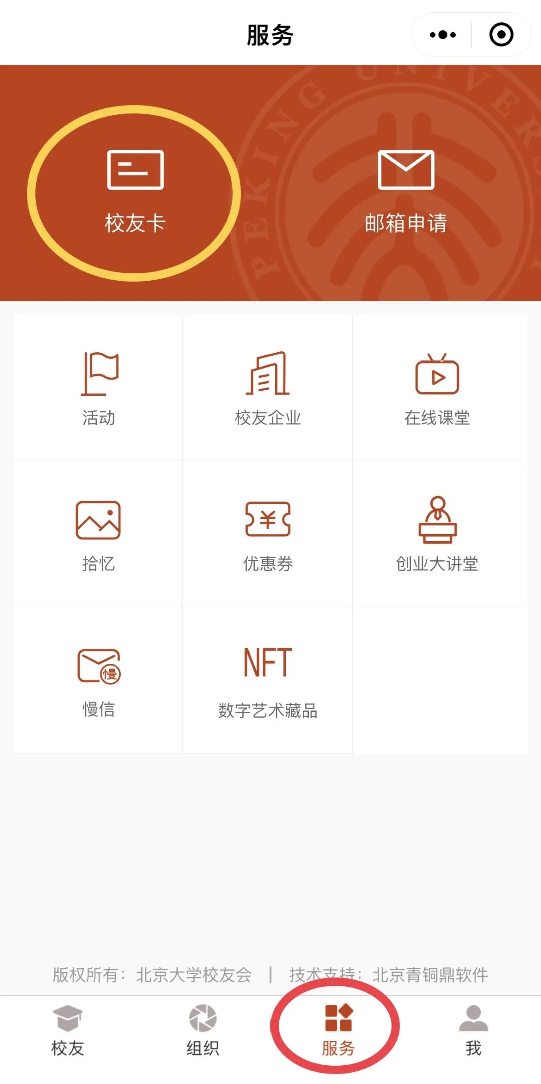 审核通过后,进入【北大校友】小程序,点击【服务】—【校友卡】即可查看。