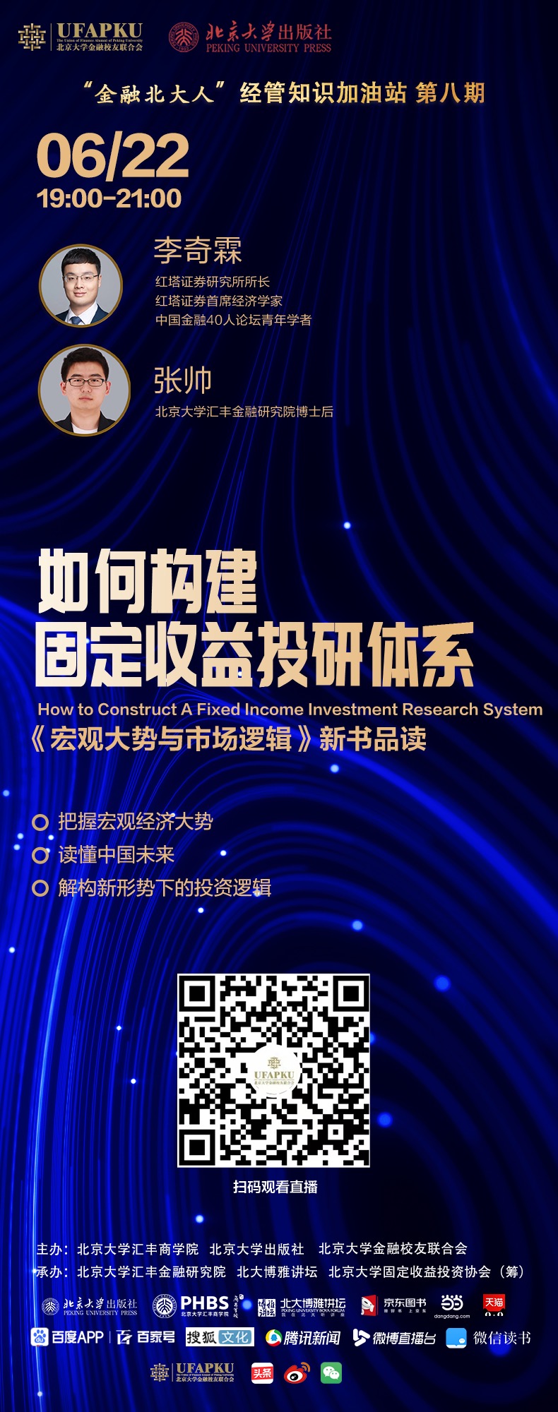 本次“金融北大人”第八期经管知识加油站邀请到红塔证券研究所所长、首席经济学家李奇霖与北大汇丰金融研究院博士后、《北大金融评论》特约编辑张帅,将于6月22日(周二)晚7点带来主题为“如何构建固定收益投研体系”的线上精彩分享,带领各位金融北大人共同品读《宏观大势与市场逻辑》,把握宏观经济大势,读懂中国未来,解构新形势下的投资逻辑。