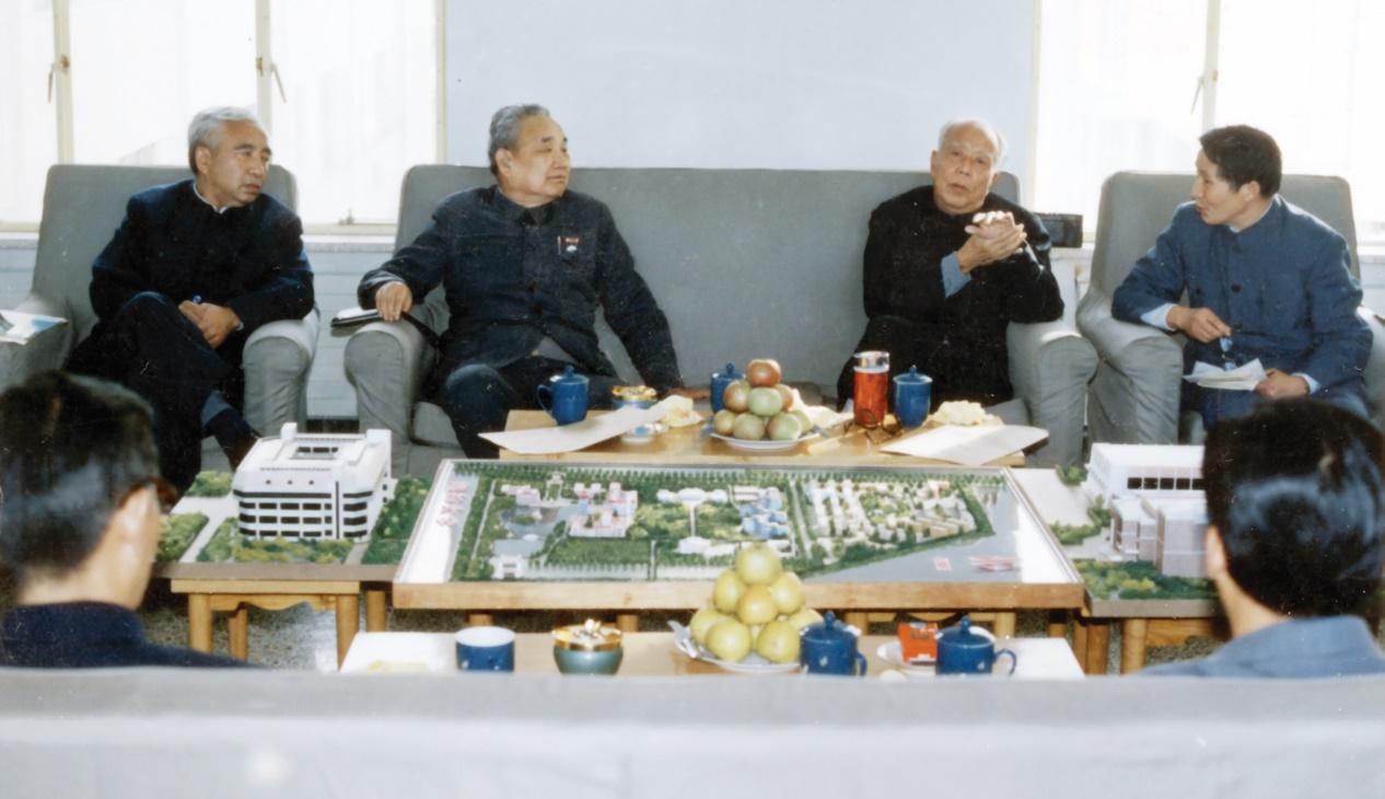 1985年10月30日,国务院代总理万里(右二)到烟台大学视察,名誉校长张承先(左二)、校长沈克琦(右一)等接待