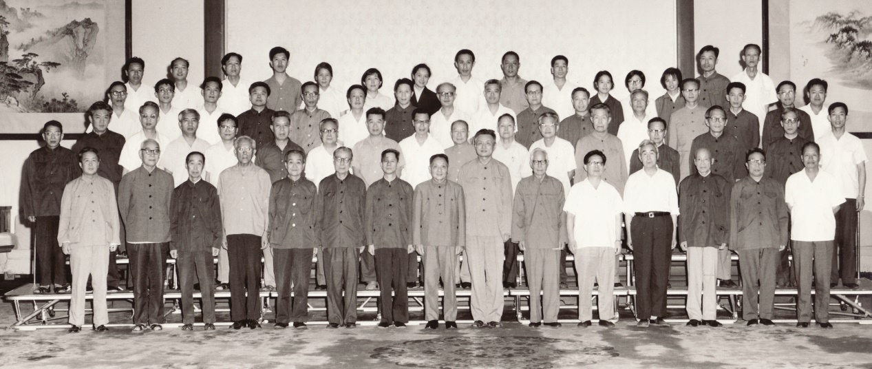 1977年8月,邓小平(一排左八)与全国科学和教育工作座谈会代表合影(一排左四为周培源,三排左七为沈克琦)
