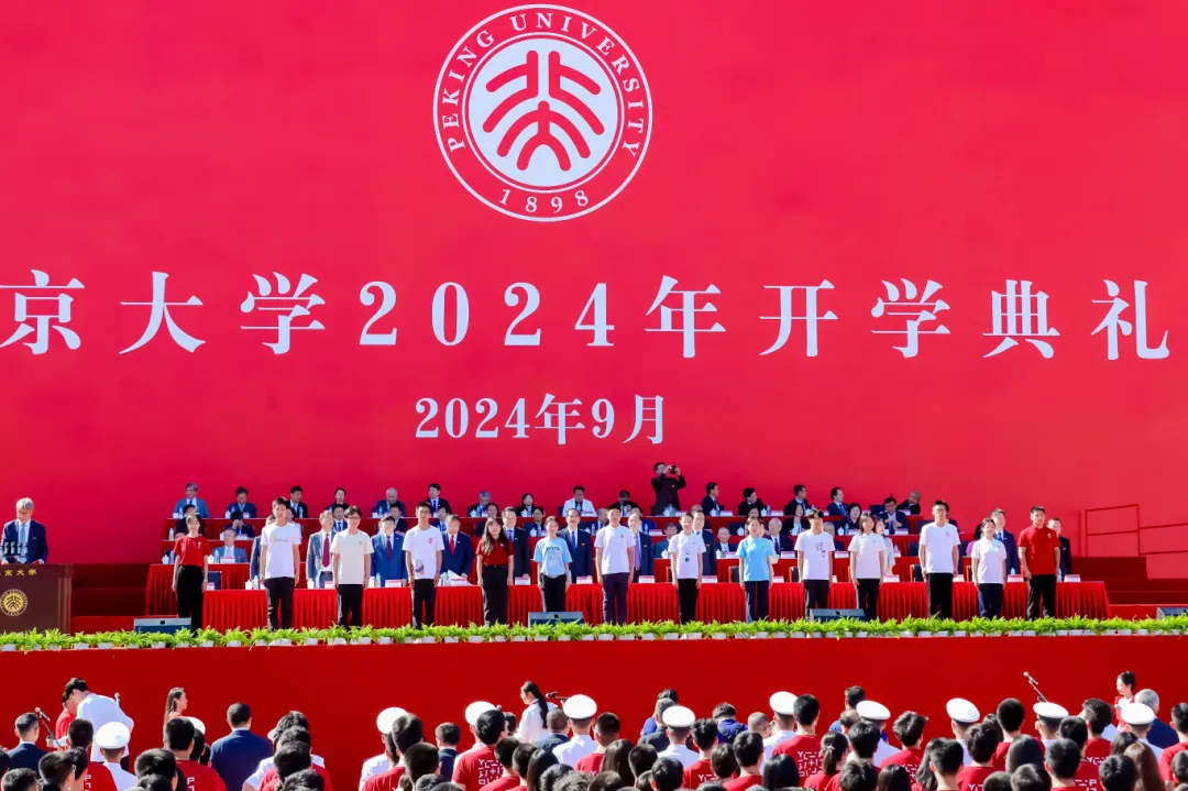 周亦楷在北大开学典礼上作为新生代表佩戴校徽(右三)