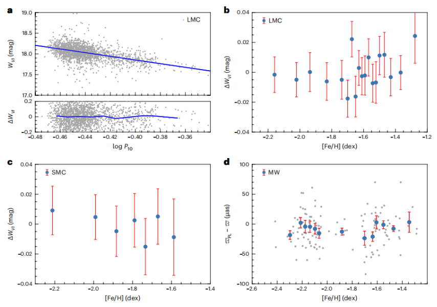 这说明针对此前难以测量的金属丰度,可以使用容易测量的两个周期代替,借此可以得到双周期天琴座 RR 型变星的周期和光度之间的关系,从而能够建立双周期天琴座 RR 型变星的量天尺。