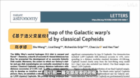 2018年,陈孝钿等人发布了第一个红外全天变星星表,表中包含了1339颗造父变星。次年,基于这个星表,陈孝钿在国际顶级学术期刊《自然—天文》发文,发布首张银河系恒星盘三维全貌图。这张图显示,银河系恒星外盘存在惊人的“翘曲结构”,换句话说,银河系并非像一个圆盘,而有点像一块薯片。