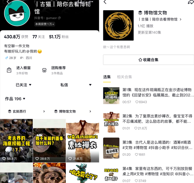 在抖音上,“古猫陪你去看博物馆”绝对是个独树一帜的账号,从8000年前的贾湖骨笛到清朝“手办”陶塑金丝猫,从长江底下的重庆碑林到春熙路下面的南宋古街,“古猫”不仅视野纵贯古今,还能将文物同现代人的日常生活、流行用语结合起来。
