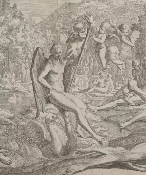 《春》局部,一个带翼丘比特在一群天鹅的陪伴下坐在大地热情的火焰球上。