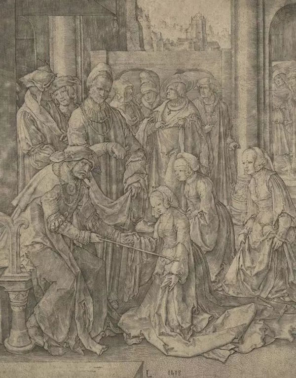 卢卡斯·凡·莱顿(1494-1533)《在国王亚哈随鲁面前的以斯帖》铜版画。
