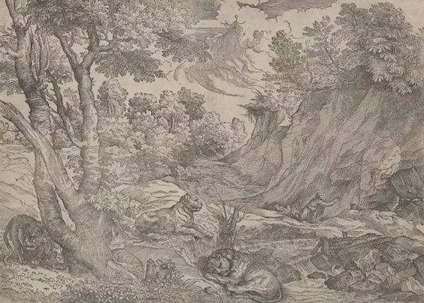 提香(1488-1576),《圣·杰罗姆在沙漠》,木刻画,约1525-1530年。尼科洛·博德里尼制作