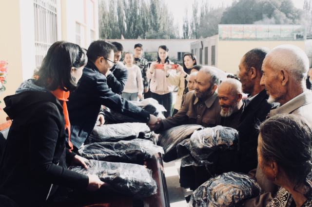 第三天的一大早我与钟梓欧来到一个名不见经传的村庄——墩都热村。准备将50件冬衣、100套文具发放到贫困老人和中小学生手中。村里为我们准备了简单的发放仪式。在冬衣发放现场,90岁高龄的茹则罕·喀吾力老人眼含热泪,用生硬的普通话说“共产党亚克西”,还同时竖起大拇指,以此表达内心的感激。在文具发放现场,接受捐助的学生阿依谢·艾散对我们说:“真的很感谢霍宗杰爷爷以及北大校友会的叔叔阿姨们给予我们的帮助,这笔宝贵的学习用品帮助了我们这些家庭困难的孩子们,把希望带到了我们身旁,把期待寄托在我们身上,我一定努力学好知识,以后报效祖国,回馈社会。”