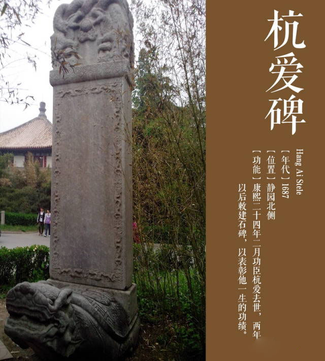 爱碑—杭爱碑位于静园草坪北侧,是建于清康熙年间的石碑。石碑文字已漫漶不清,但据碑文推测,碑应是为纪念康熙时功臣杭爱,表彰他一生的功绩而建。石碑古朴庄严,饱经风霜。石碑基座为赑(音同币),形似乌龟,碑顶雕刻有螭,两者都是龙的九子,常用作石碑装饰。