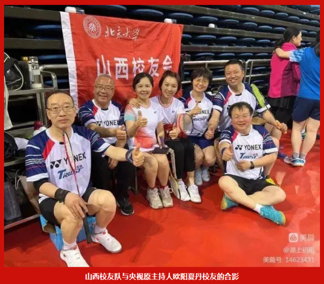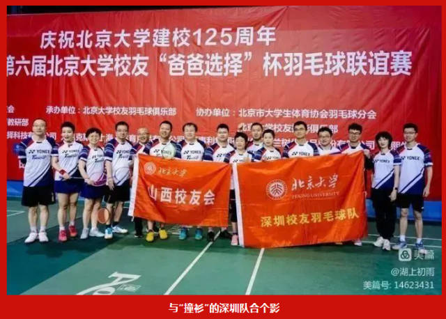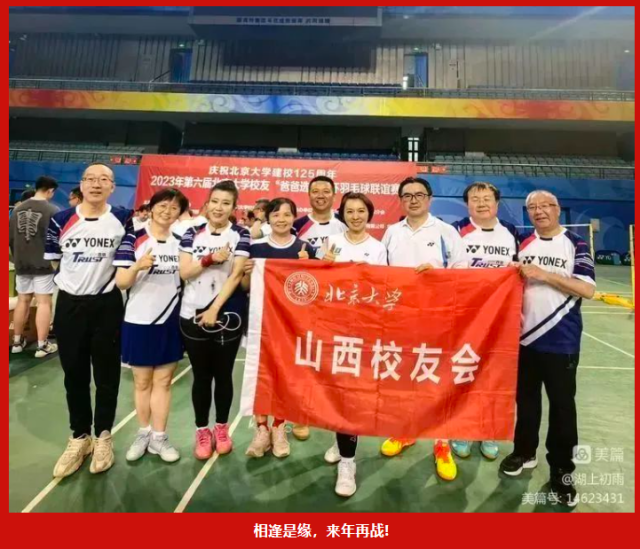 2023年5月3日,为庆祝北京大学成立125周年,由北京大学校友羽毛球俱乐部精心筹备的第六届北京大学校友羽毛球联谊赛在邱德拔体育馆如期举办。来自五湖四海、各行各业的近480名北大校友,经校友组织及年级推荐参赛,组成39支团体赛队伍和35对双打组合,在球场上燃情拼搏,呈现了一场场精彩的羽毛球比赛。由薛刚、牛俊杰、王涛、赵超、胡晓波、赵云虹、王丽等组成的山西百信队在乙组团体赛中荣获优胜奖,与前几届相比,略有进步。