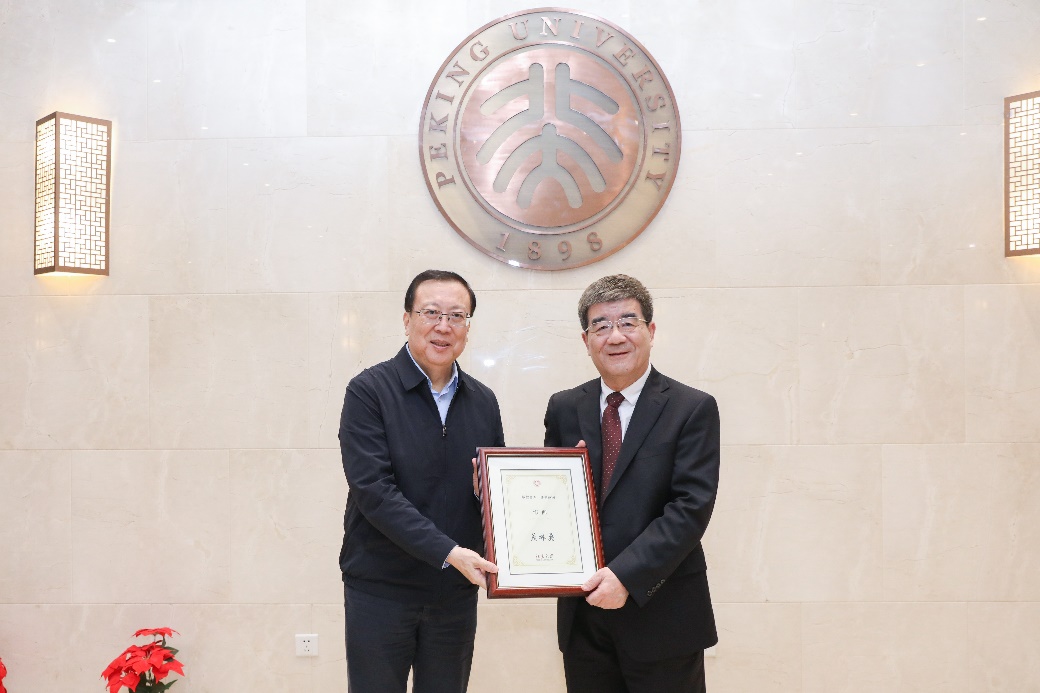 在全场热烈的掌声中,郝平向海闻颁发“茂林奖”奖牌,感谢他对北大教育事业的支持。校领导向捐赠方代表颁授教育贡献奖,并致赠感谢状。