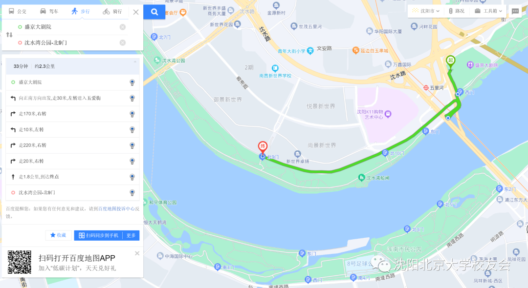 3、9:30会长杨继野宣布活动开始。校友们沿风景秀丽的风景区线路徒步行走单程约2.7公里,到达沈水湾公园北9门附近,打卡拍照。再回到盛京大剧院正门,路程总计5.4公里。