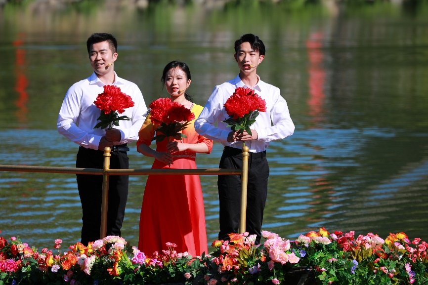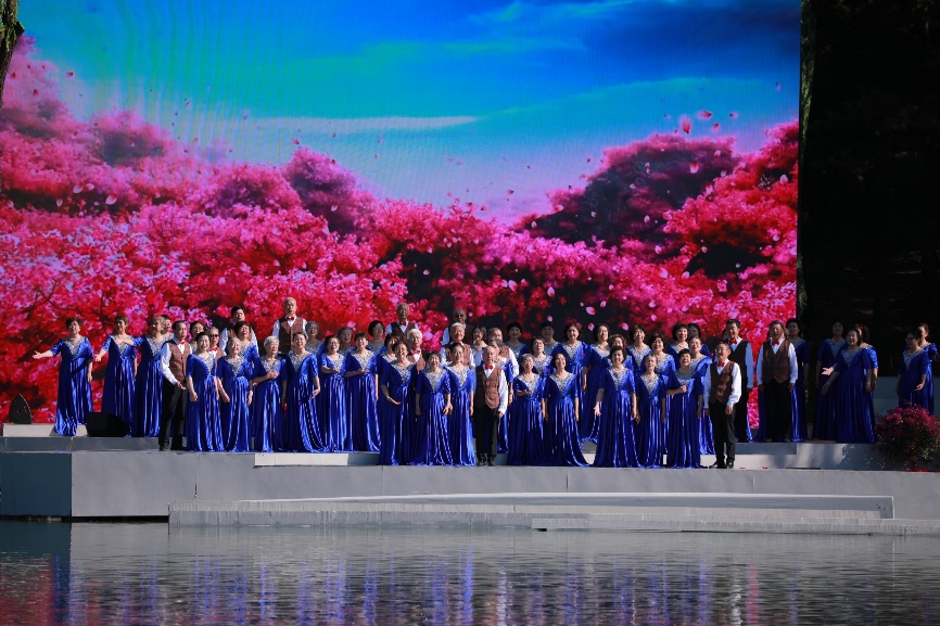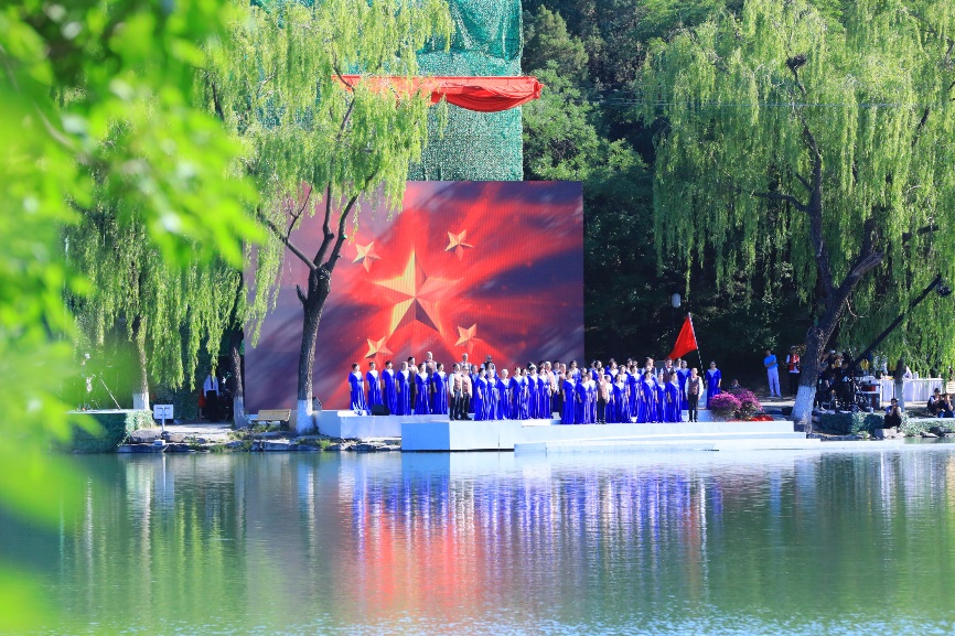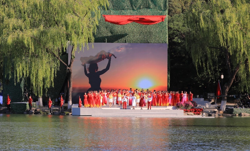 最后,全场人员齐声合唱《没有共产党就没有新中国》,352名学生旗手环绕心形未名湖,摇动红旗,未名湖仿若一片红色海洋。