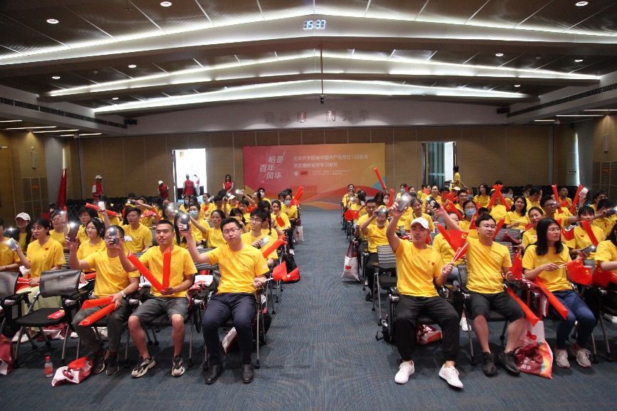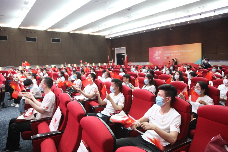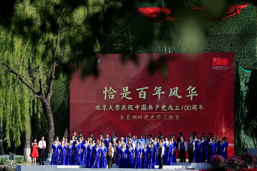 全校2500余名师生齐聚未名湖畔,唱响百年颂歌,回望伟大征程。此次活动还面向全校师生直播,1500余名师生在国际关系学院秋林报告厅、新太阳学生中心B101教室、光华管理学院301报告厅分会场共睹盛会。一时间,未名湖畔红旗飞扬、百年燕园歌声嘹亮,全校师生接受了一场沉浸式的党史学习教育和一次震撼灵魂的理想信念洗礼。