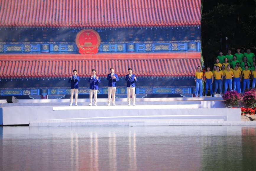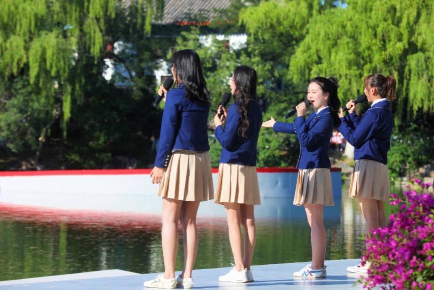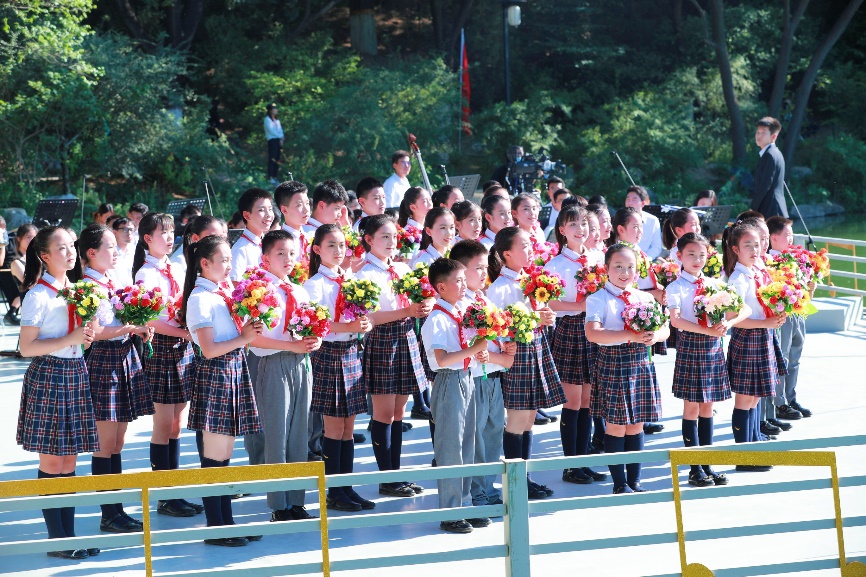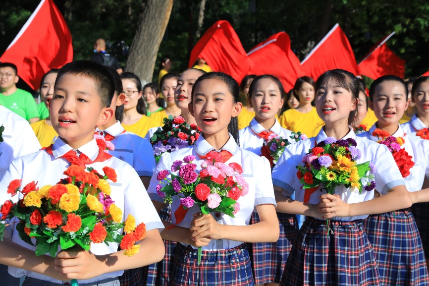 北京大学附属小学少儿合唱团的40名同学,胸前佩戴着红领巾,迎着夏日暖阳唱响《我和我的祖国》,用嘹亮的童声展现当代“10后”对党领导建立的美好新中国的真挚热爱与深情赞颂。