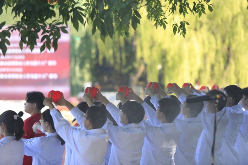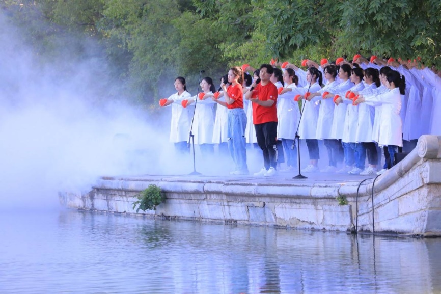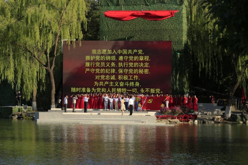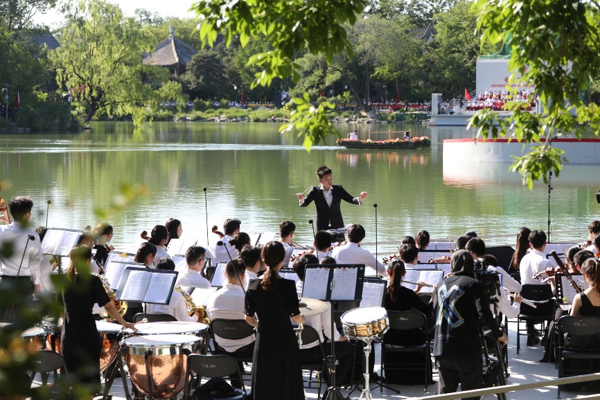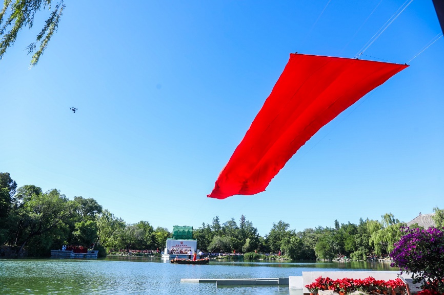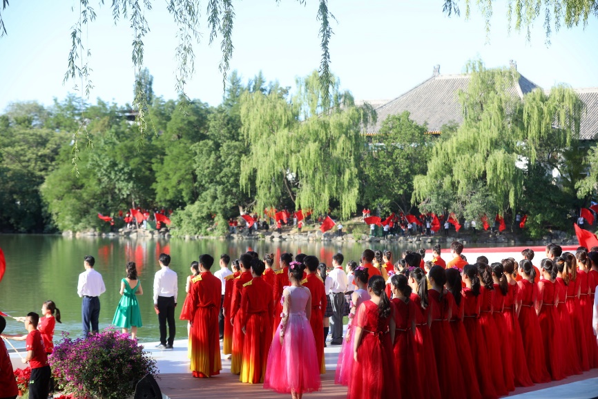 随着一条红绸飞渡未名湖南北,一曲《唱支山歌给党听》拉开了北京大学庆祝中国共产党成立100周年未名湖畔党史学习教育的序幕。红与绿的唯美交织,123年来北大始终与党和人民同心同向同行,北大青年始终把自己的理想同祖国的前途、把自己的人生同民族的命运紧密联系在一起,扎根人民、奉献国家的精神跃然湖面。
