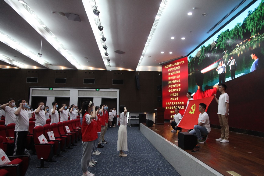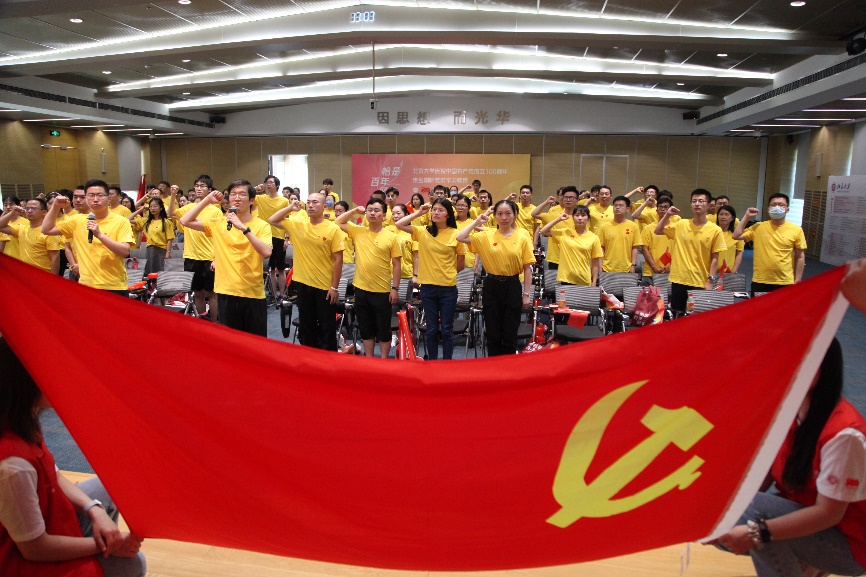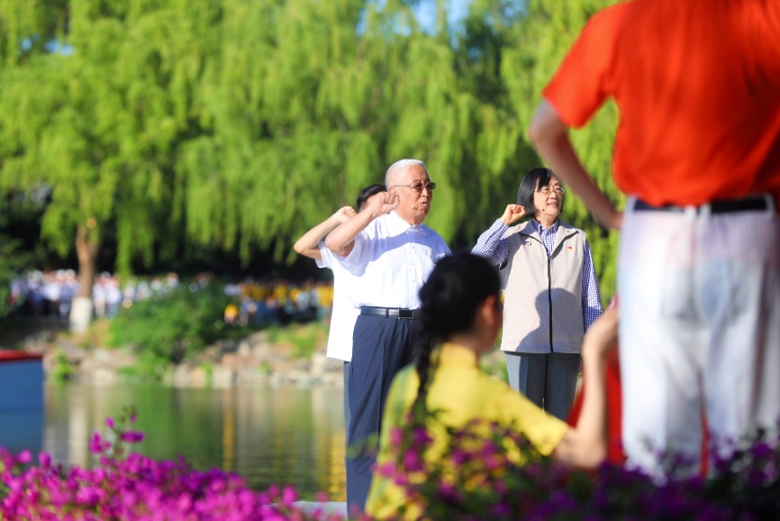 本次党史学习教育特别设置重温入党誓词环节。在北京大学优秀共产党员标兵、著名医学科学家、教育学家、中国工程院院士、北京大学第一医院名誉院长郭应禄老师,北京大学优秀共产党员标兵、历史学系教授、人文社会科学研究院院长邓小南老师,法学院2019级硕士研究生、即将赴祖国西部基层就业的平措顿珠同学的领誓下,全场师生起立,“我志愿加入中国共产党”的声音震彻湖畔、震撼人心,不少师生激动落泪,爱党爱国的真情激荡喷涌,感人至深。