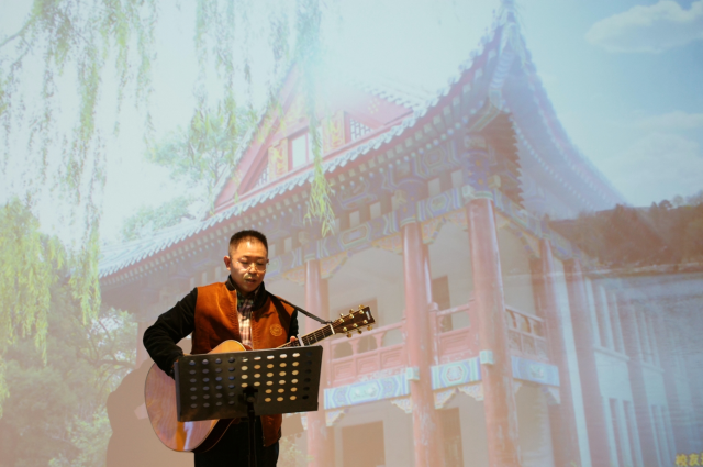 87级社会学系的姜大力校友表演了吉他弹唱,一首是自己作词作曲,歌唱家乡的歌曲《朝阳》,一首是为87级技物系黄继忠同学的诗词谱曲的《离愁》,纪念这位才华横溢、英年早逝的同学。