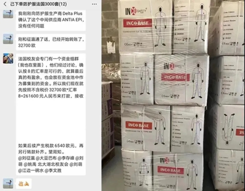 第四批医疗物资是抗疫一线医务人员可以在医院“红区”使用的一级防护服。在2月14日,湖北校友会使用全球校友捐款,通过法国校友会采购下单。法国校友会会长刘征瀛亲自组织校友们建立欧元资金池,为湖北校友会兑换购买防护服外汇提供方便,又专门组织了由律师、物流专业的校友组成的物资保障团队。