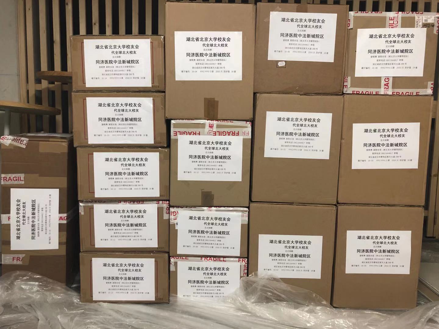 2020年2月10日14时,当得知北大第三批医疗队所在的鄂州市中心医院急缺医疗物资后,湖北校友会会长刘萌马上联系购买口罩。在校友会副会长杨三文、秘书处工作人员姚禹和梅秋荣等人的通力配合下,不到一个小时的时间,使用全球北大人捐款购买的10000个医用口罩就从北京发出,预计将于11日中午12时运抵鄂州。这已经是湖北校友会受全球北大校友嘱托,直援北大医疗队的第六批医疗物资。