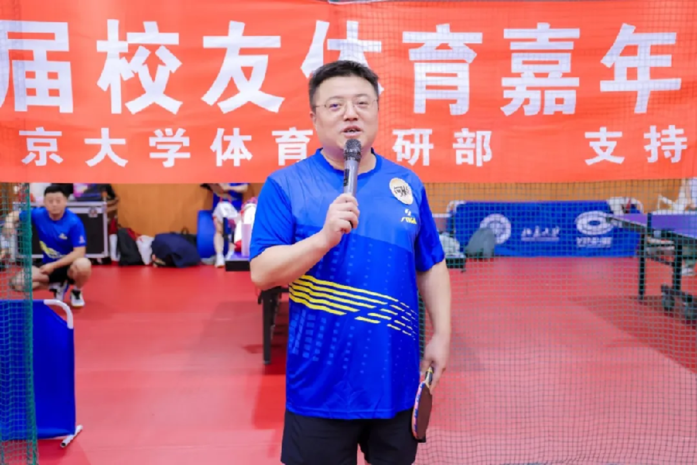 校友赞助单位代表、北大法学院校友、北京蓝石律师事务所主任何胜文发言。他对本次校友乒乓球联谊赛的举办表示祝贺,对到场嘉宾、裁判团队及工作人员表达感谢,并预祝本次比赛取得圆满成功。